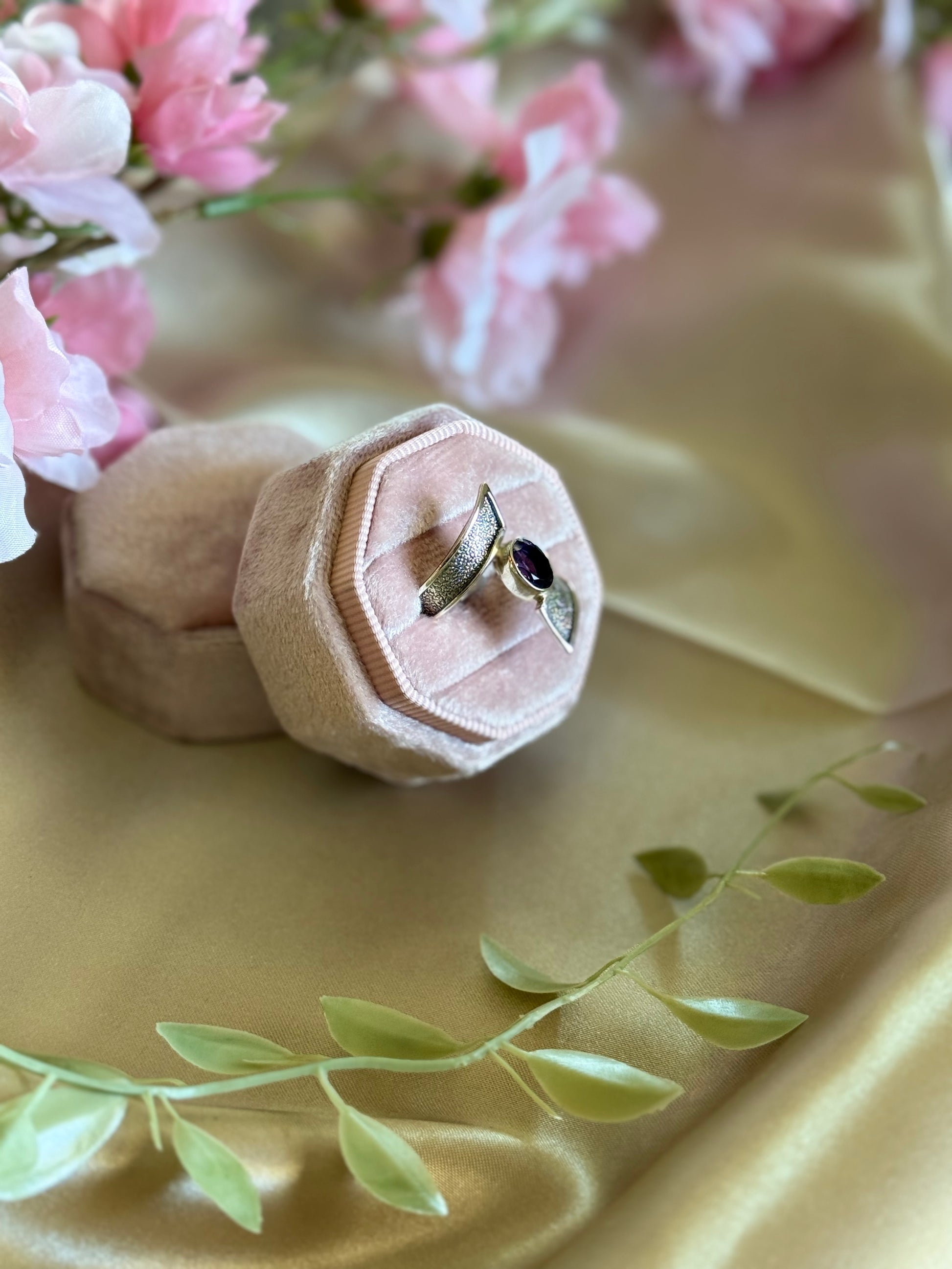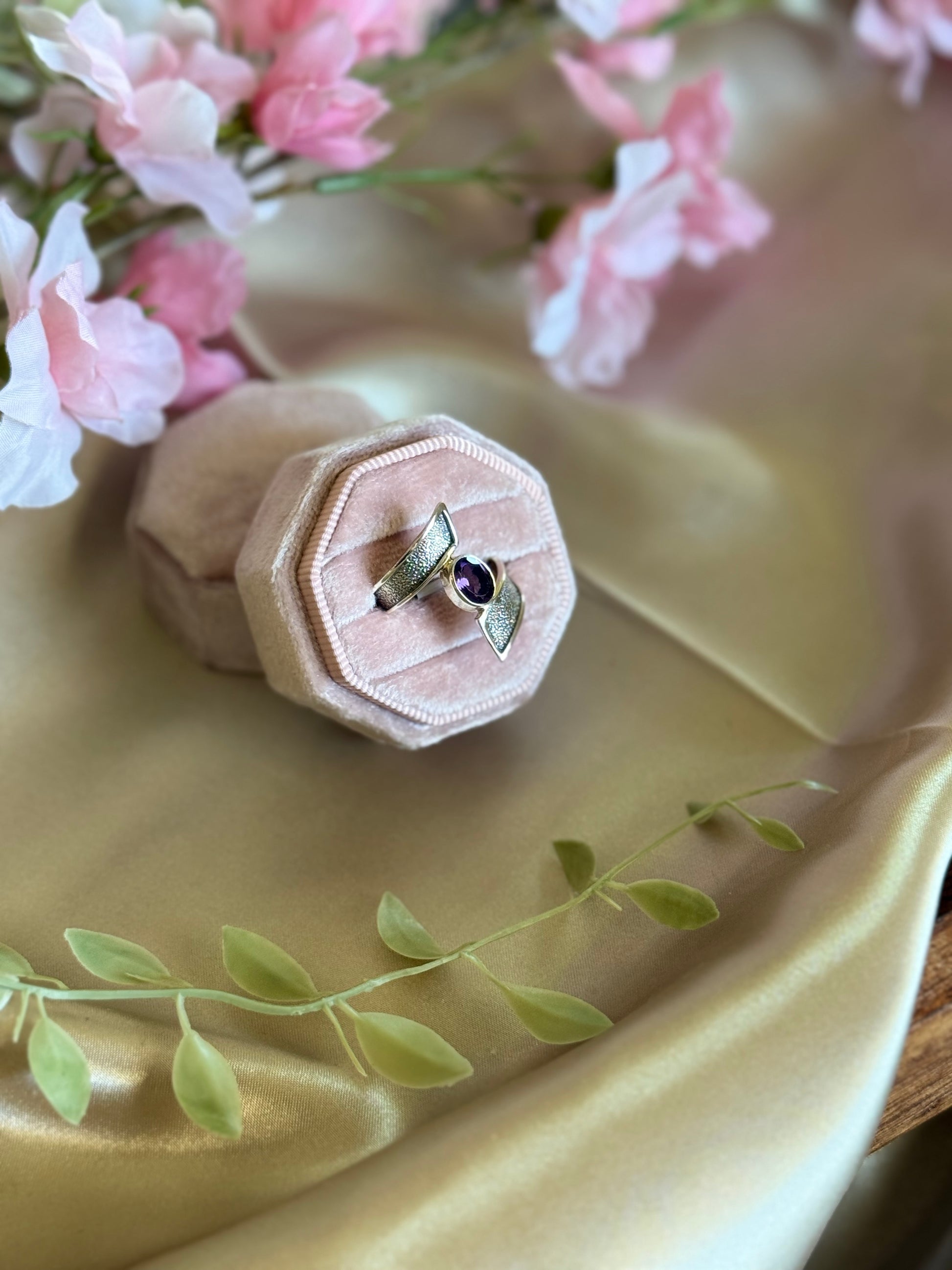 This stunning piece showcases an amethyst gemstone, gracefully set within a ribbon-inspired sterling silver band. The elegant curves and rich purple hues of the amethyst create a captivating and sophisticated look.