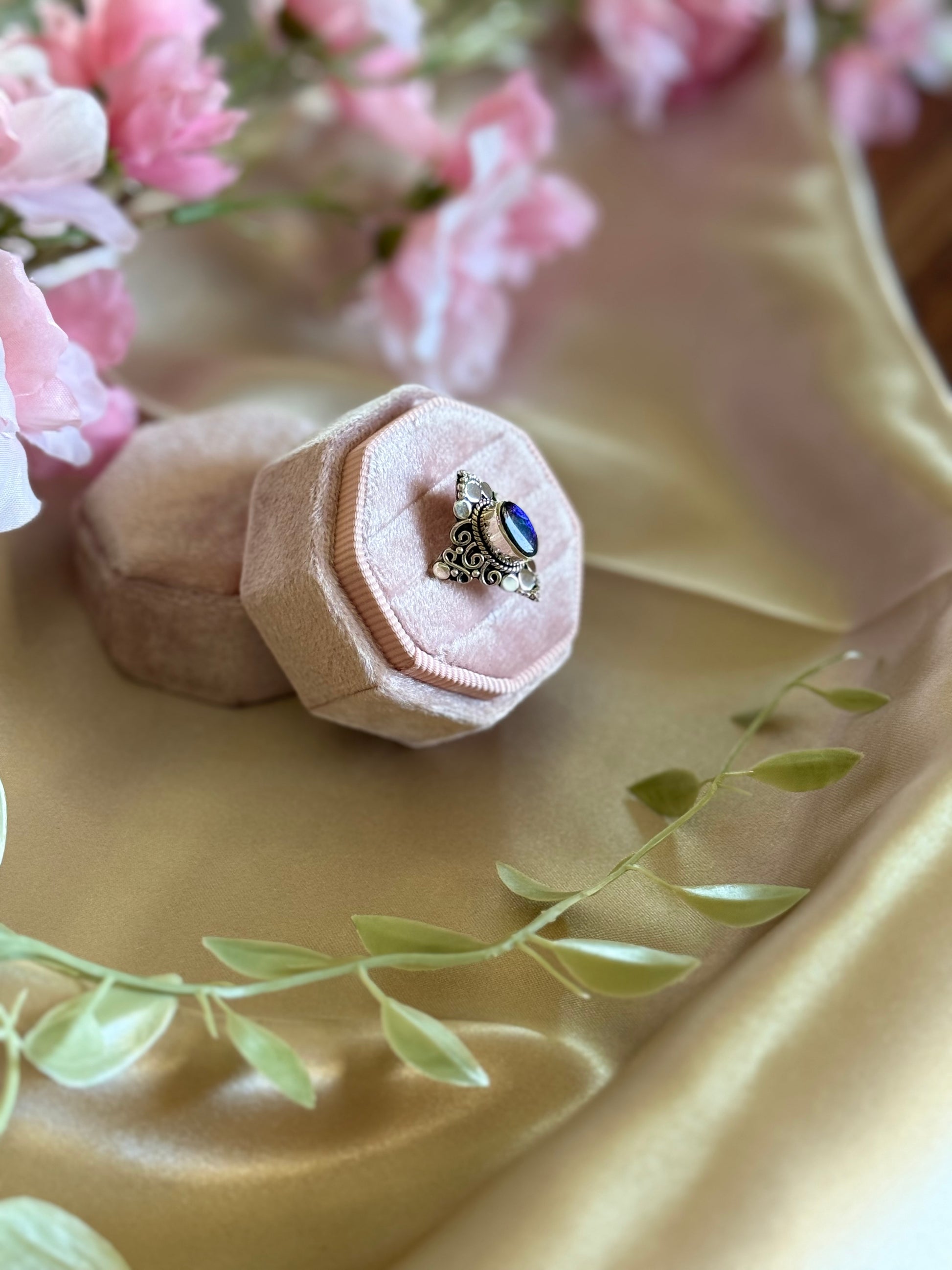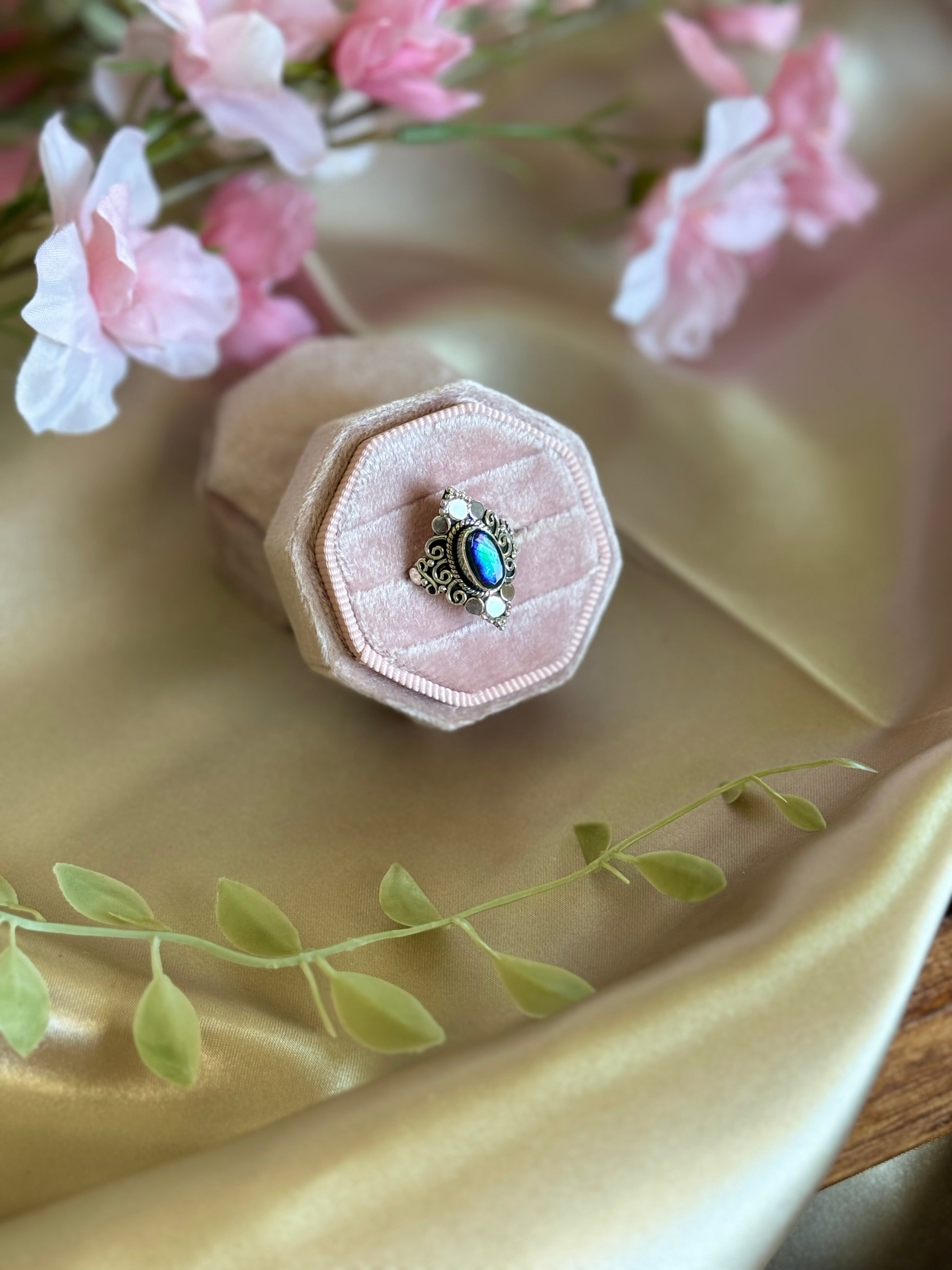 A sterling silver ring featuring a genuine ammonite fossil, each with its own one-of-a-kind pattern. Symbolizing growth and timeless beauty, this piece carries the ancient energy of the sea.