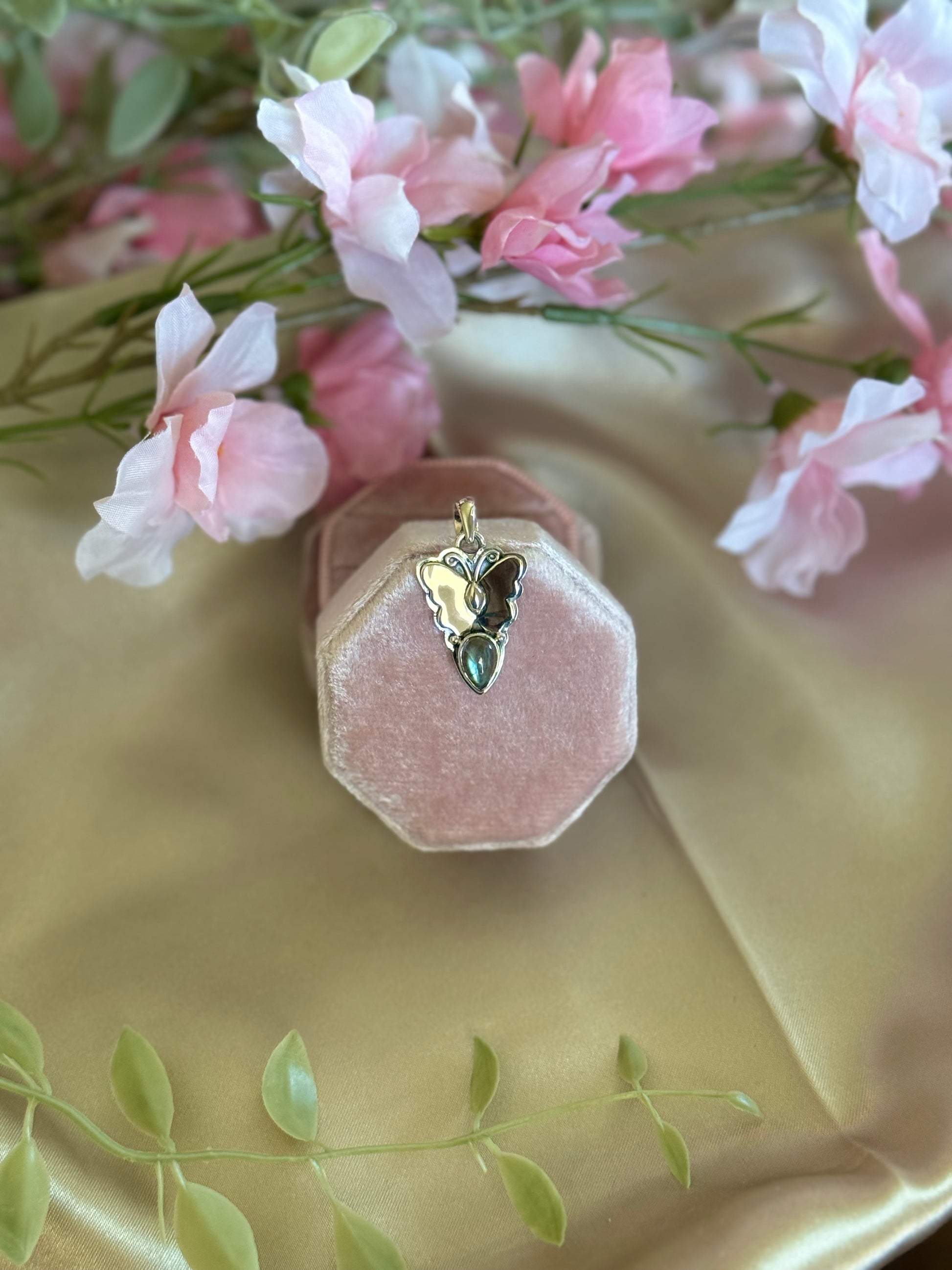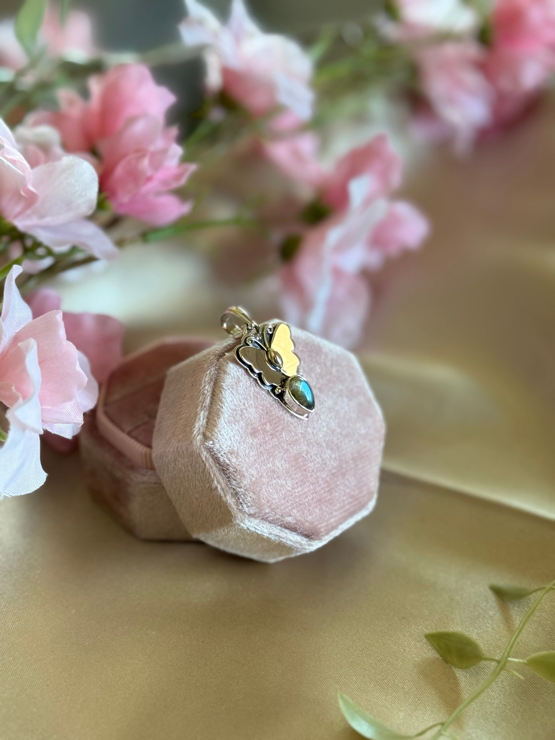 This butterfly pendant features a stunning labradorite gemstone at its base, known for its mesmerizing iridescence that changes color with the light. The intricate silver design showcases delicate butterfly wings, symbolizing transformation.