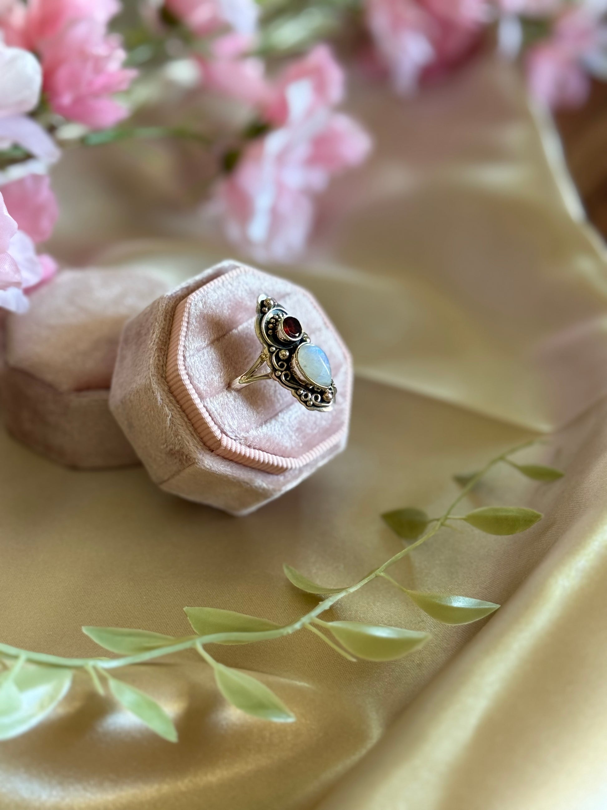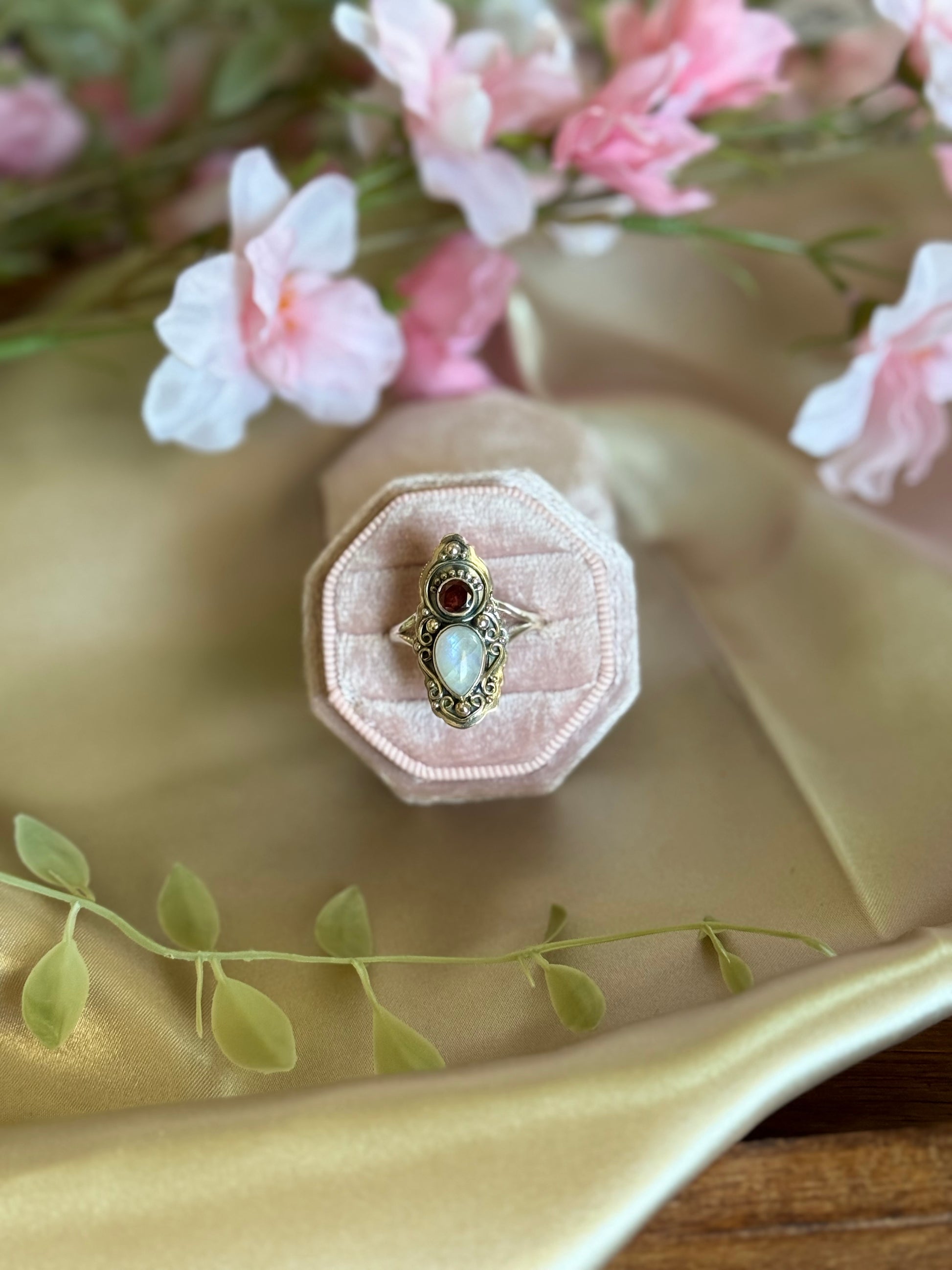 The ring showcases a striking pear-shaped moonstone at its center, radiating a soft, ethereal glow that changes with the light, symbolizing intuition and emotional balance. Complementing the moonstone is a vibrant round garnet, known for its deep red color, representing passion and vitality. The ring is elegantly set in a detailed silver band, featuring intricate designs that enhance its beauty and uniqueness. This ring not only serves as a stunning accessory but also embodies the harmonious balance between the calming energies of moonstone and the invigorating spirit of garnet.