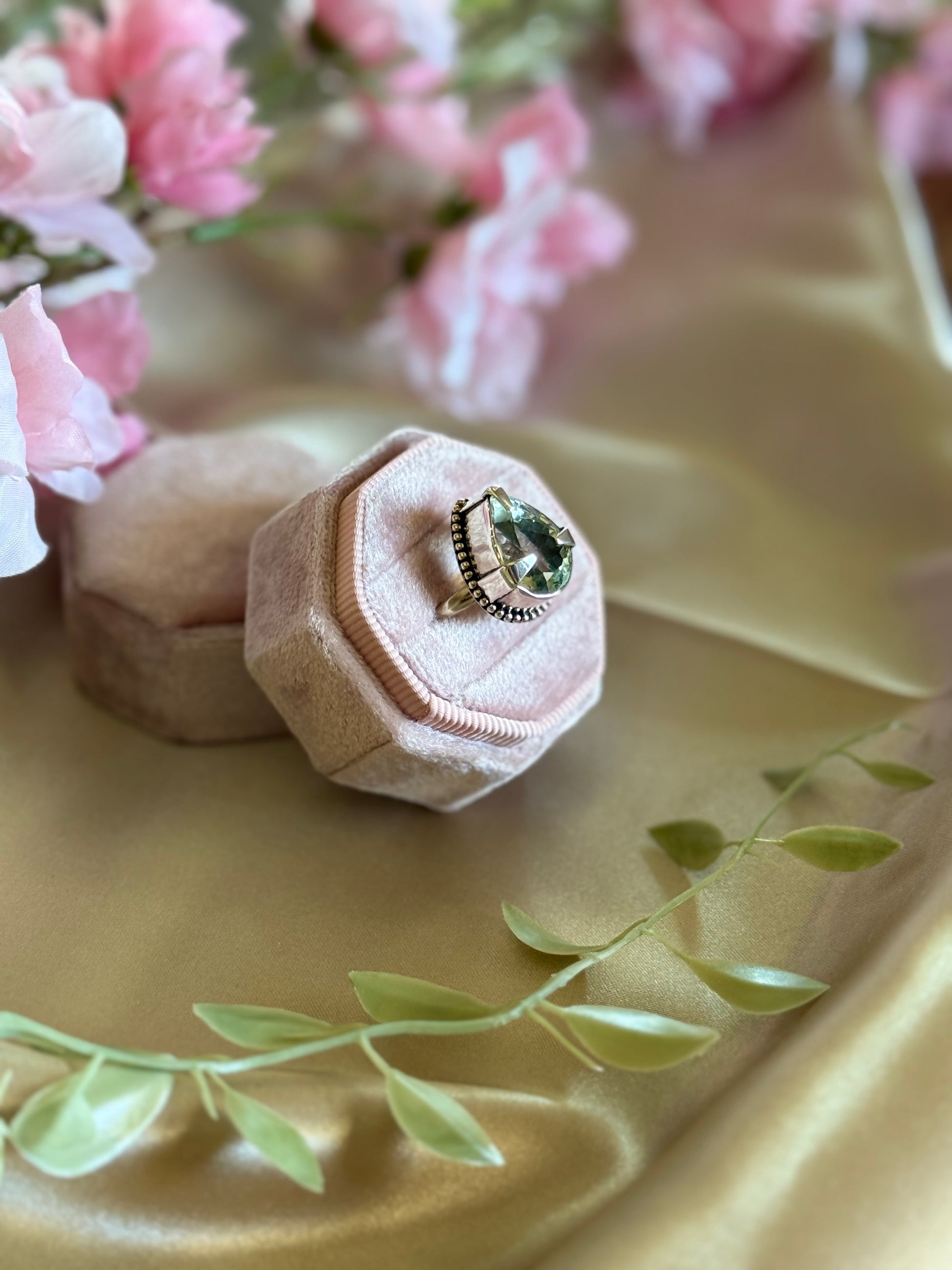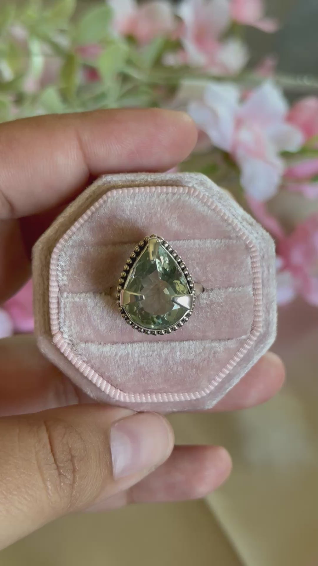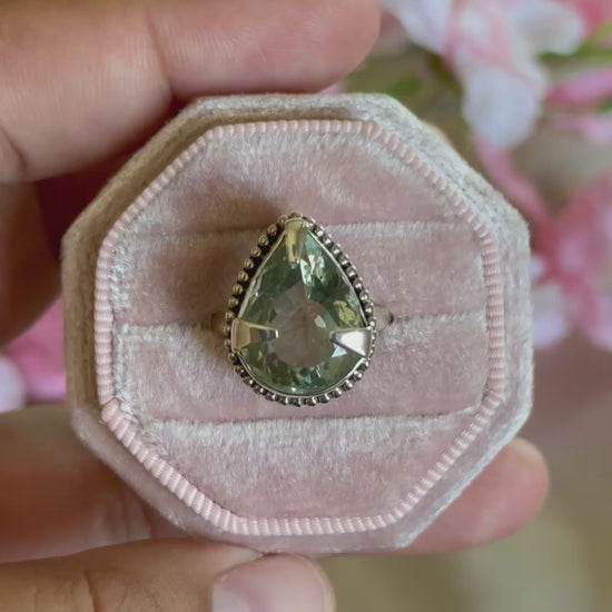 This ring features a large, pear-shaped green amethyst gemstone, reminiscent of a vibrant emerald, set in a sleek silver band. Perfect for adding a touch of sophistication and charm to any outfit, this piece is both eye-catching and elegant.