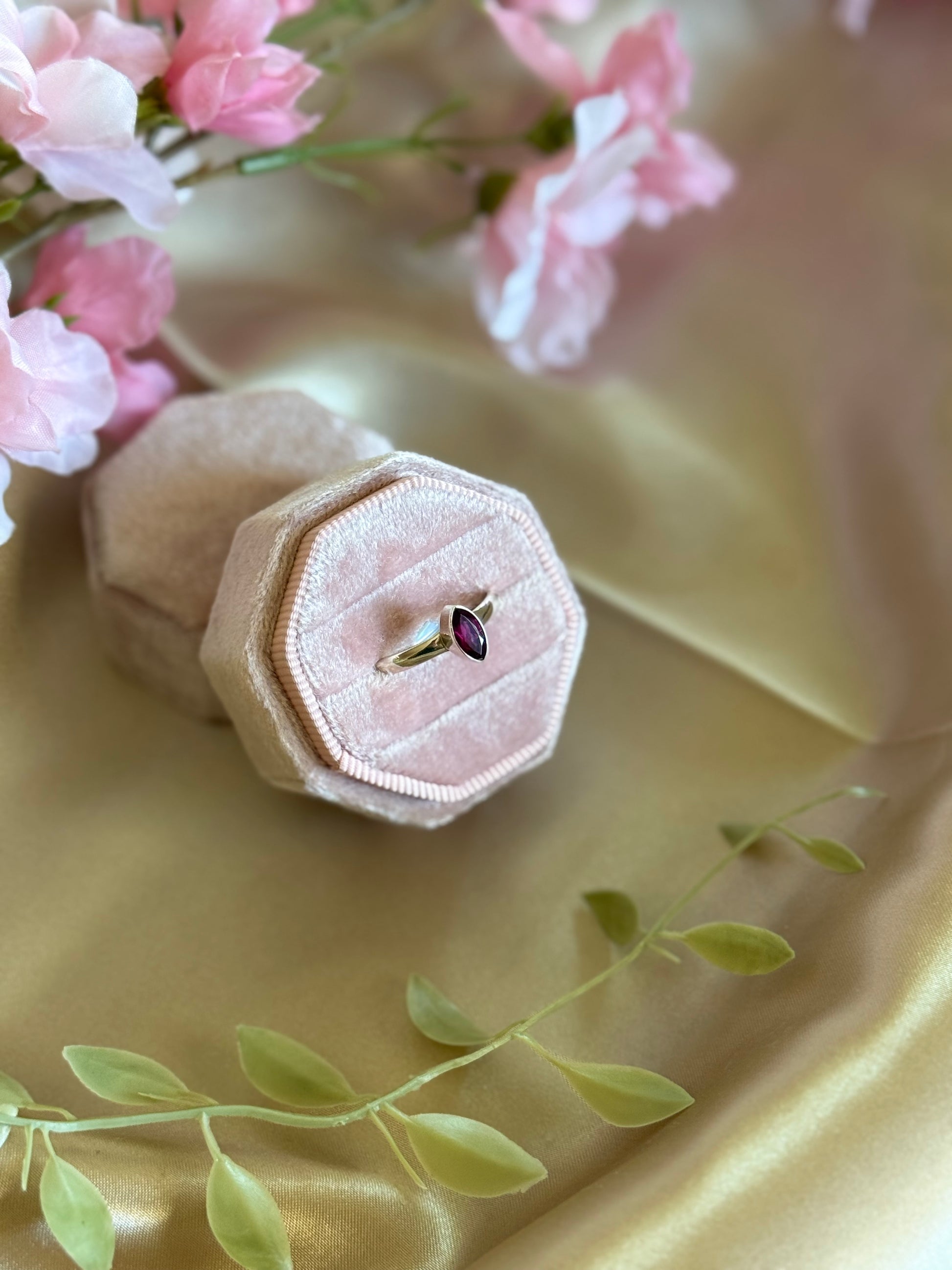 This ring showcases a stunning marquis shaped pink garnet, elegantly set in a sleek band. This gemstone symbolizes love, romance and compassion.