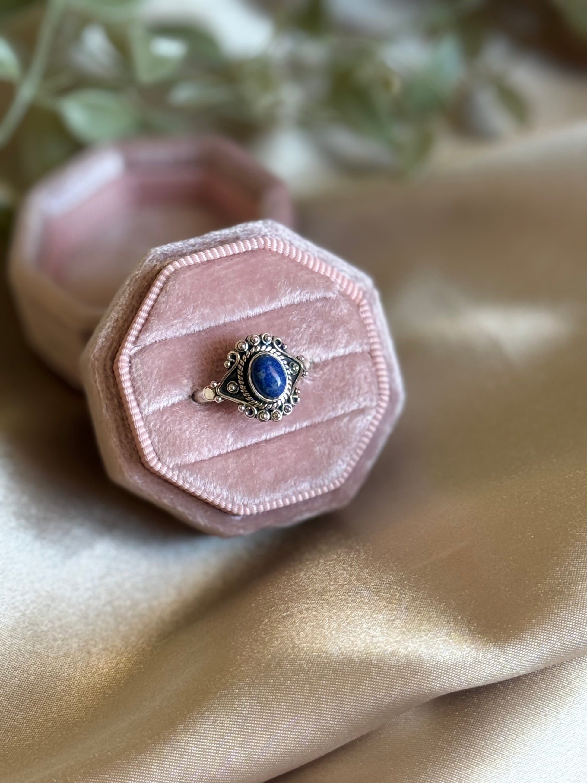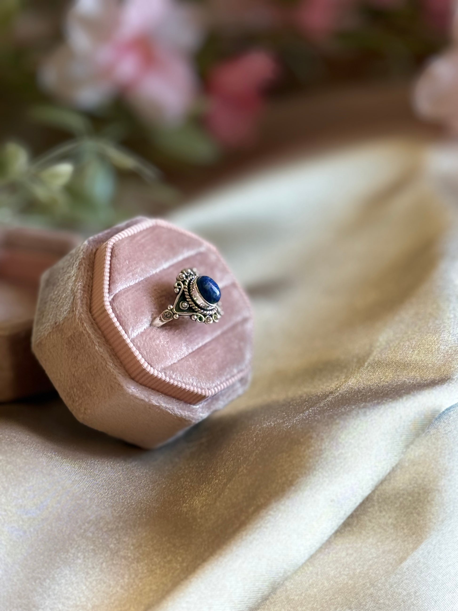 An ornate sterling silver ring centered with a deep blue lapis lazuli cabochon, accented by intricate detailing that highlights its regal charm.