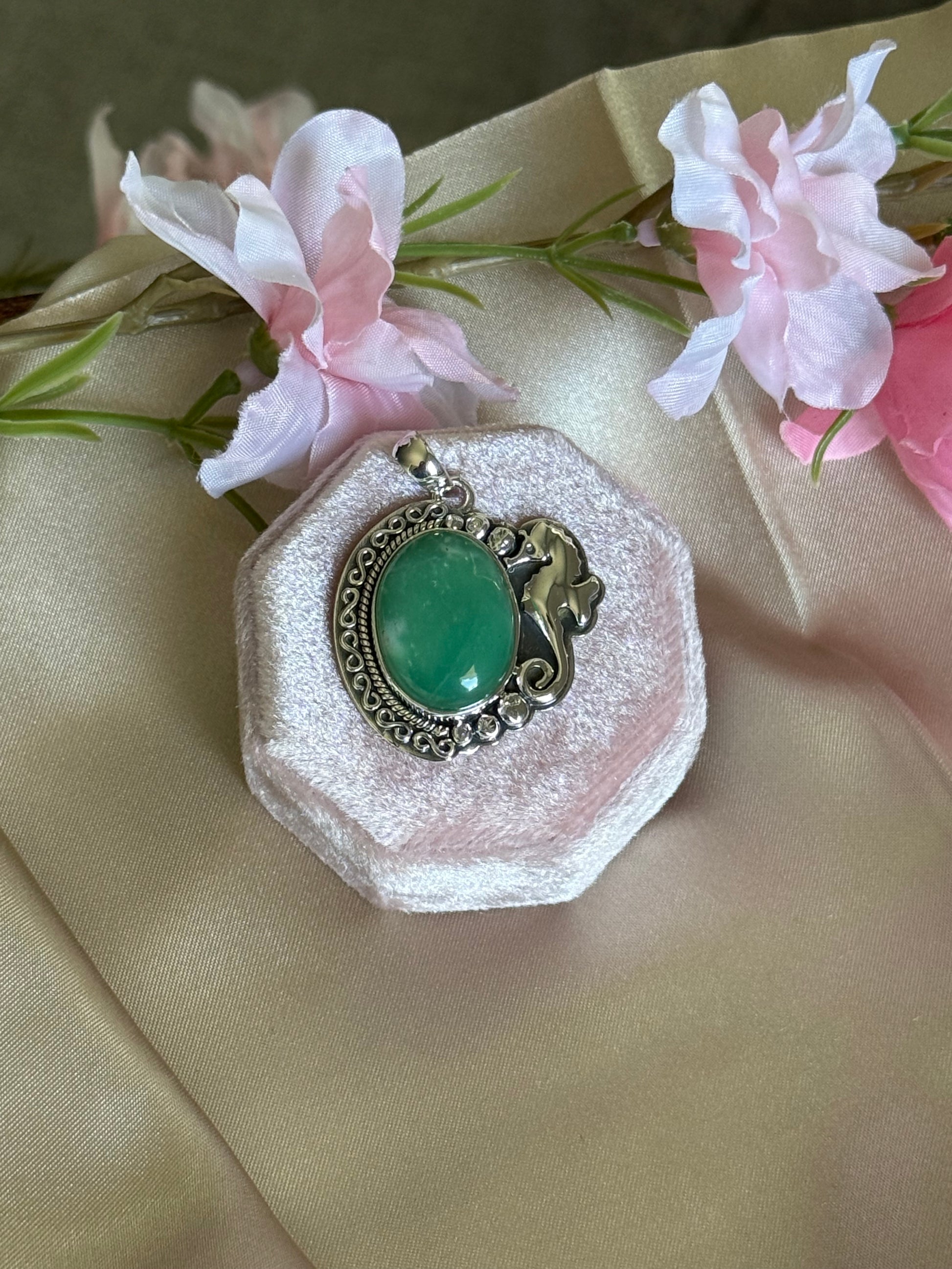 This enchanting pendant features a polished oval chrysoprase gemstone, framed in detailed sterling silver with a graceful seahorse accent. Known as the stone of joy, renewal, and abundance, chrysoprase glows with a refreshing green energy, while the seahorse symbolizes patience, protection, and gentle strength. Together, they create a piece that embodies both the beauty of the sea and the uplifting power of nature.