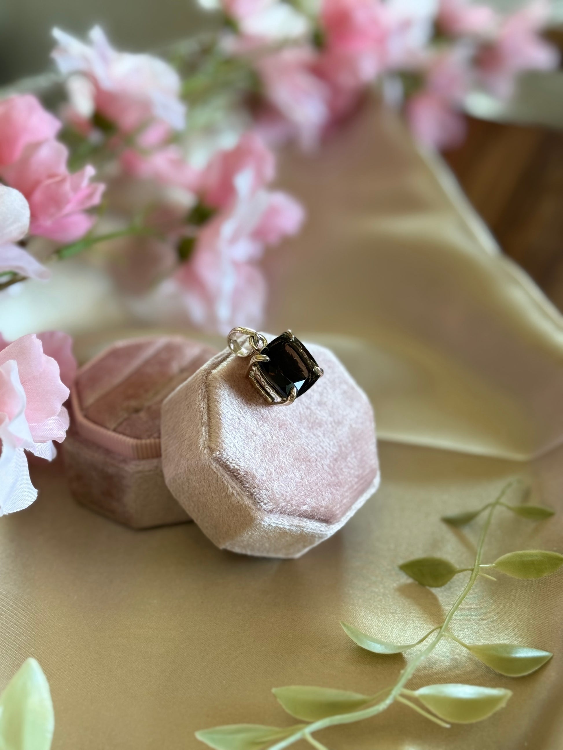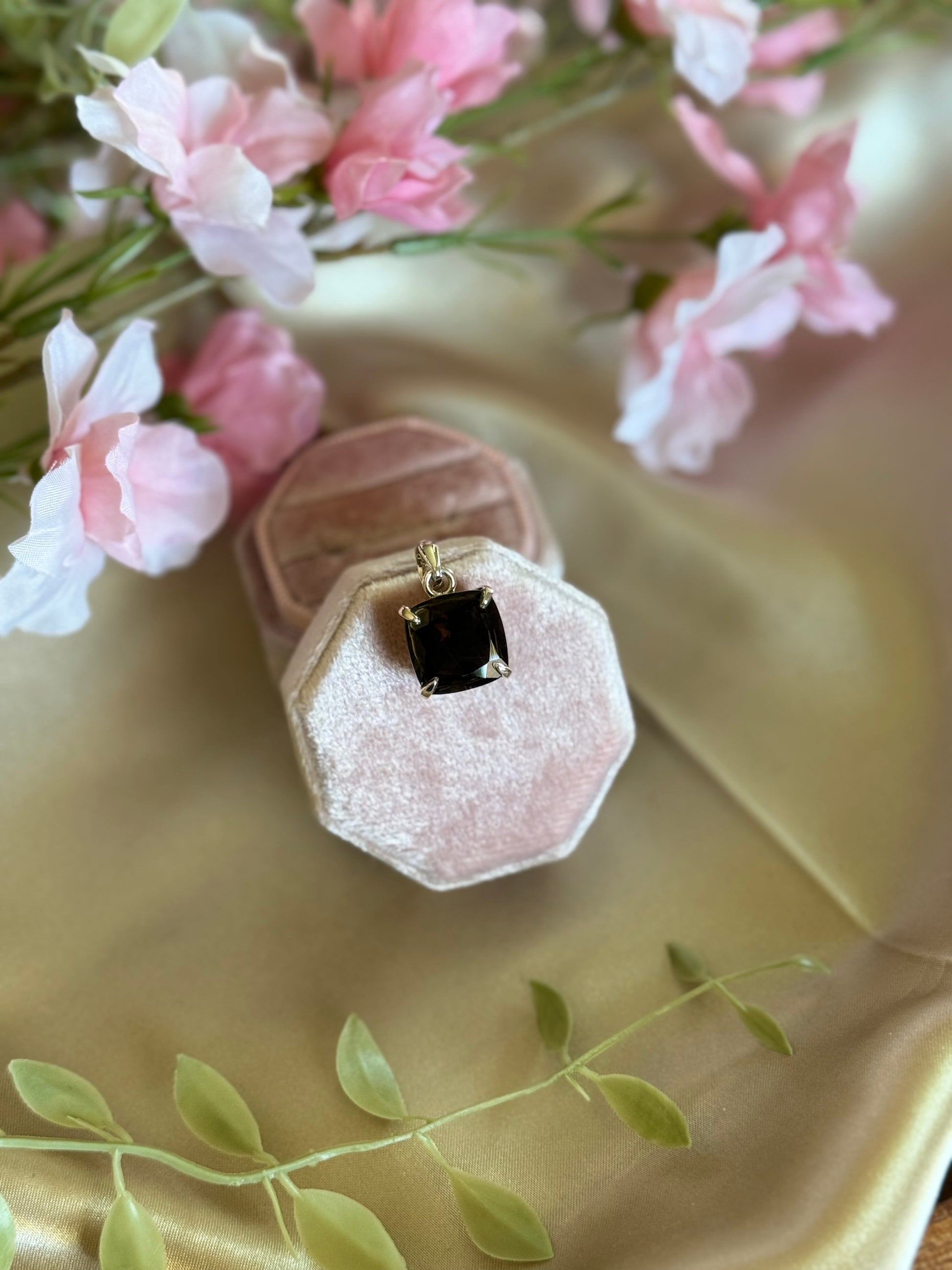 This striking pendant showcases a large, dark brown smoky quartz gemstone, elegantly set in a sleek silver frame. The square shape of the stone adds a modern touch, while the rich, earthy tones of the smoky quartz evoke a sense of grounding and tranquility.