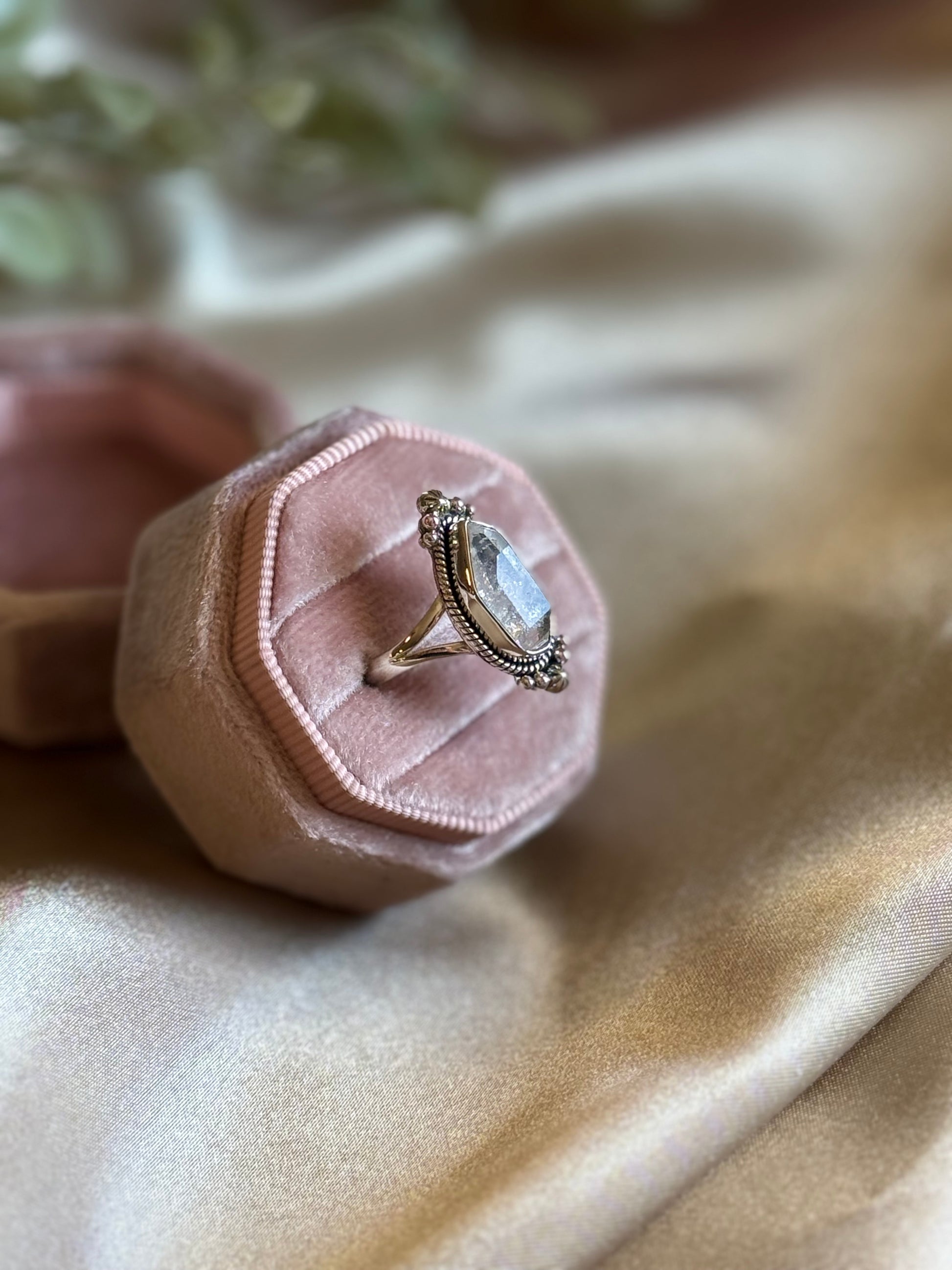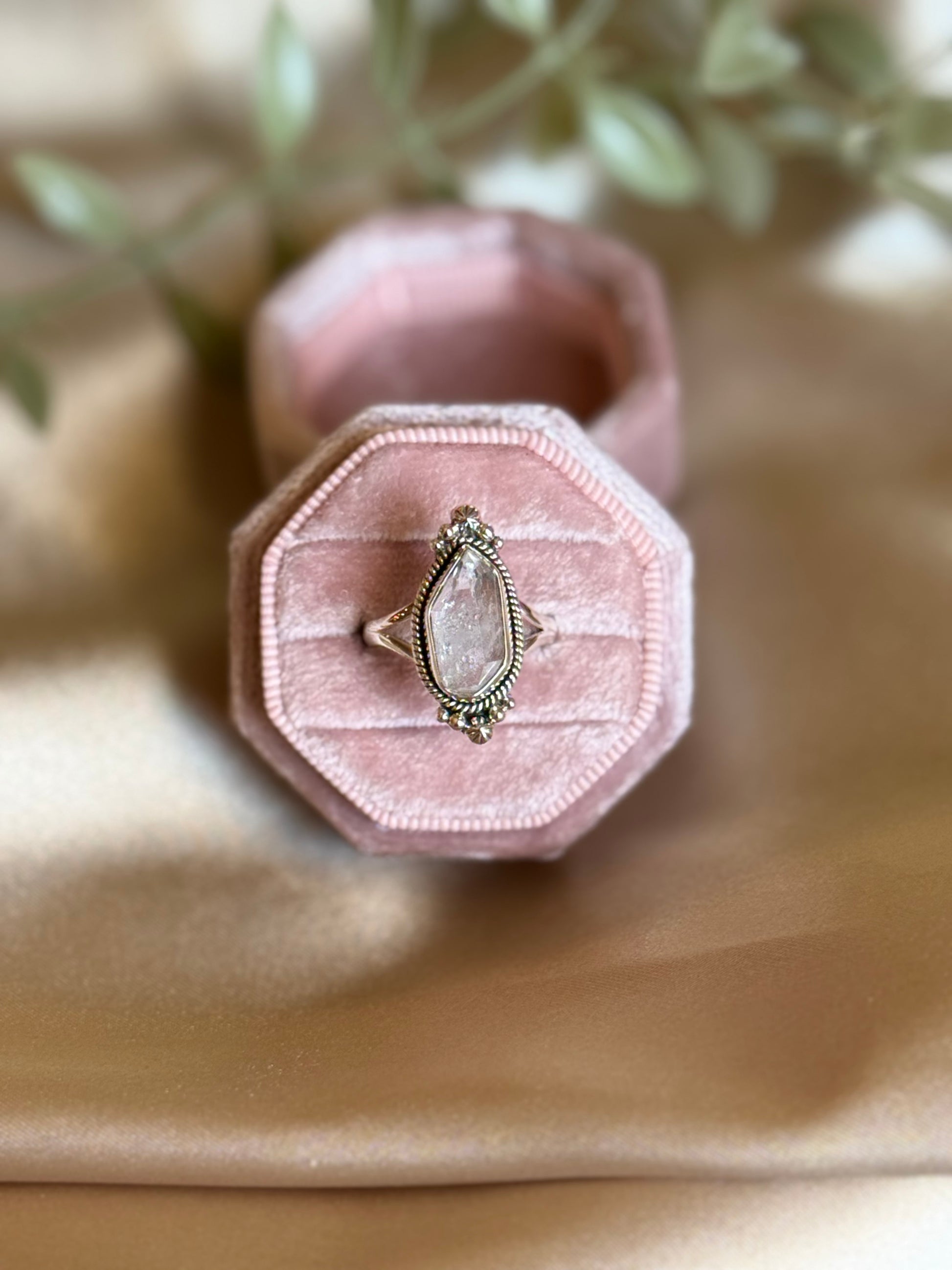 A sterling silver ring featuring a natural Herkimer diamond, admired for its clarity and sparkle. Known as a stone of pure energy and light, it makes a radiant and timeless piece.
