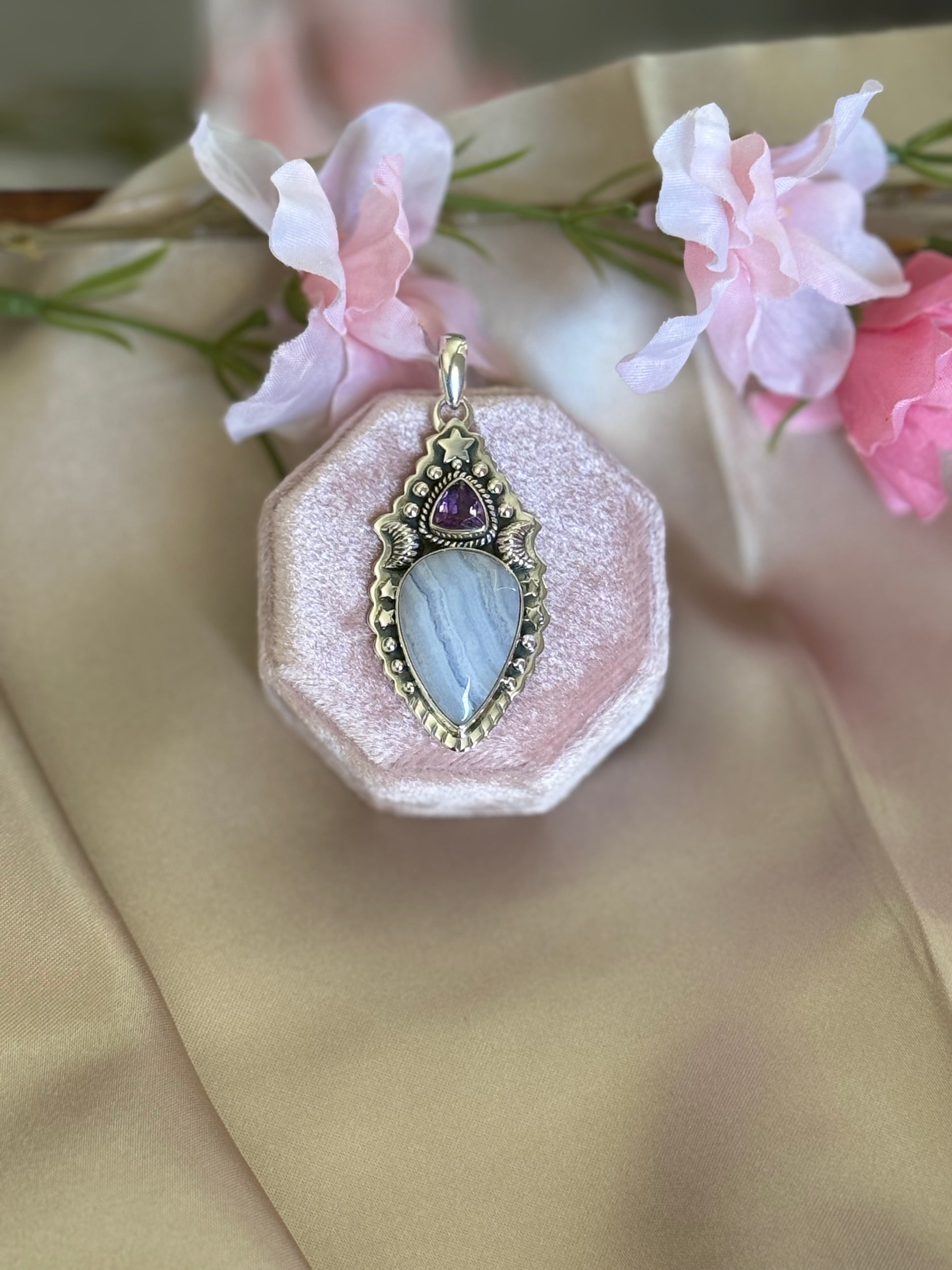 Sterling Silver Pendant – Ornate star-accent design with calming blue lace agate and purple amethyst.