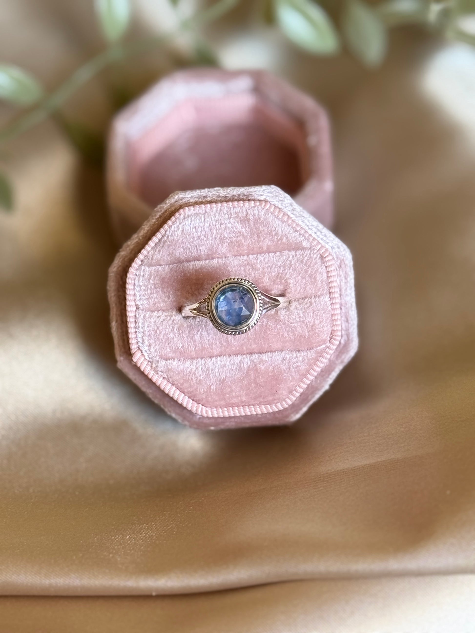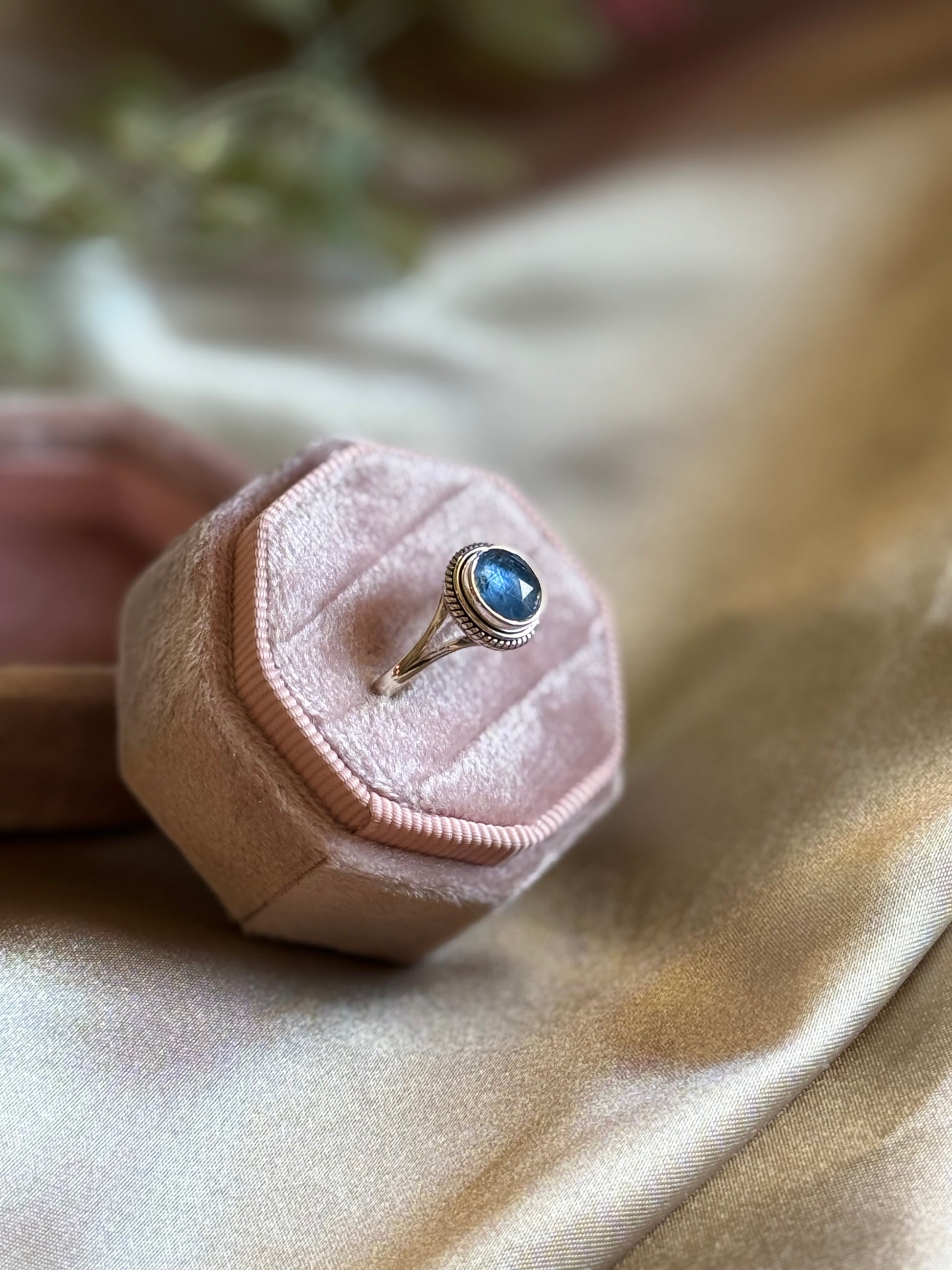 A sterling silver ring featuring a natural kyanite gemstone, glowing in serene blue hues. Known for balance and calm, it’s a graceful piece with soothing energy