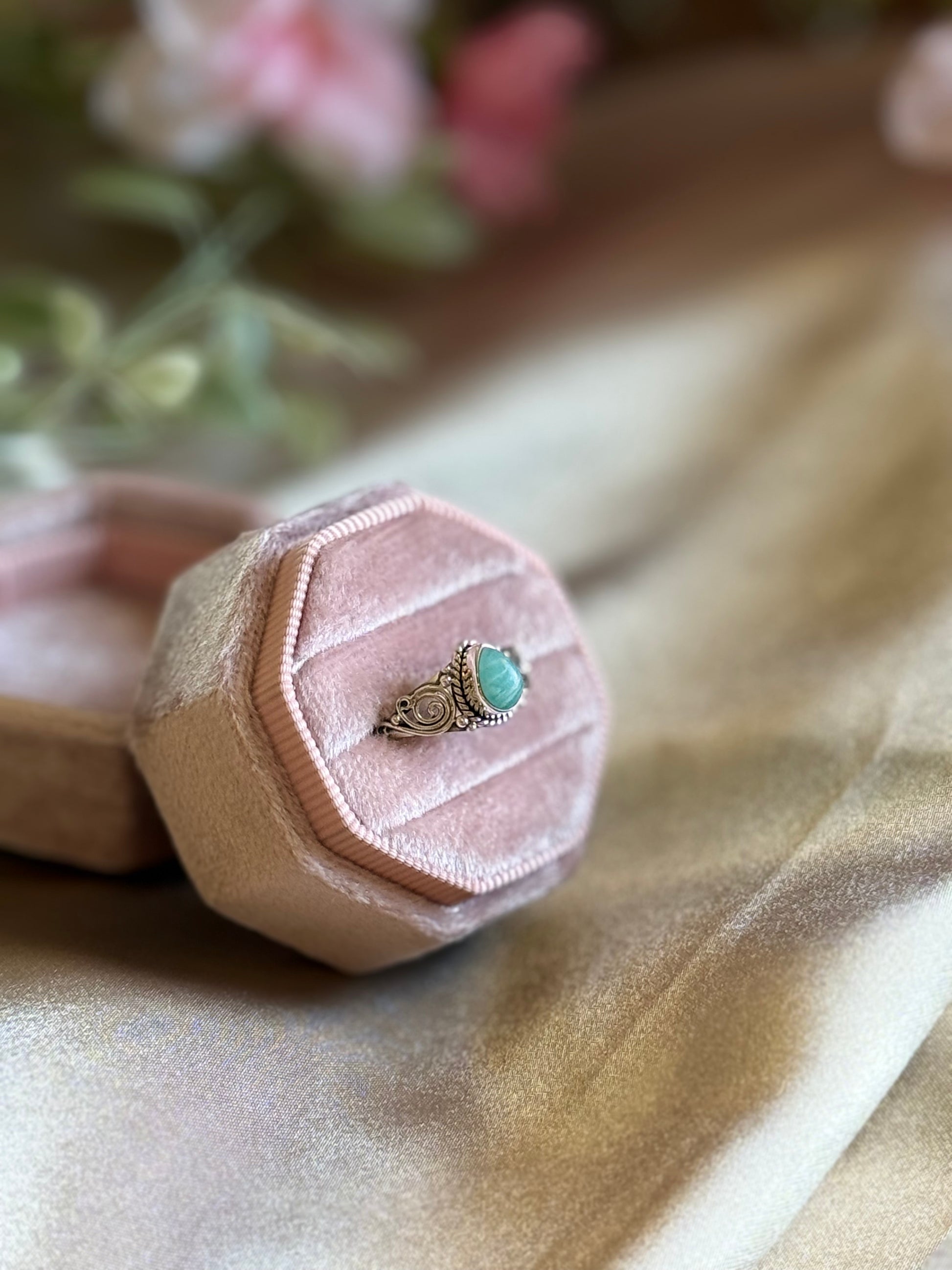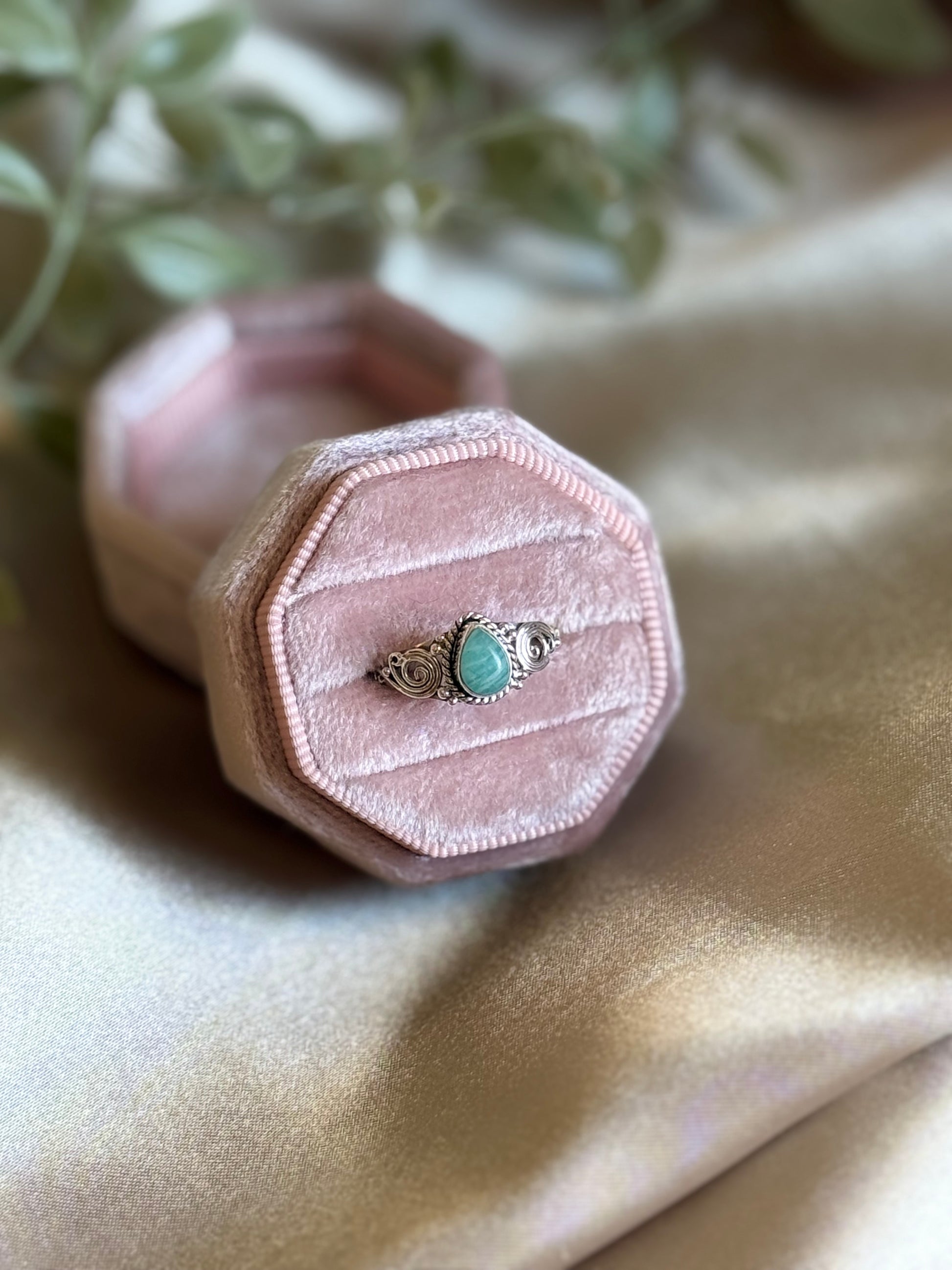 A sterling silver ring with ornate swirl detailing, set with a soothing amazonite stone. Its gentle aqua hue brings a refreshing and peaceful touch to any style.