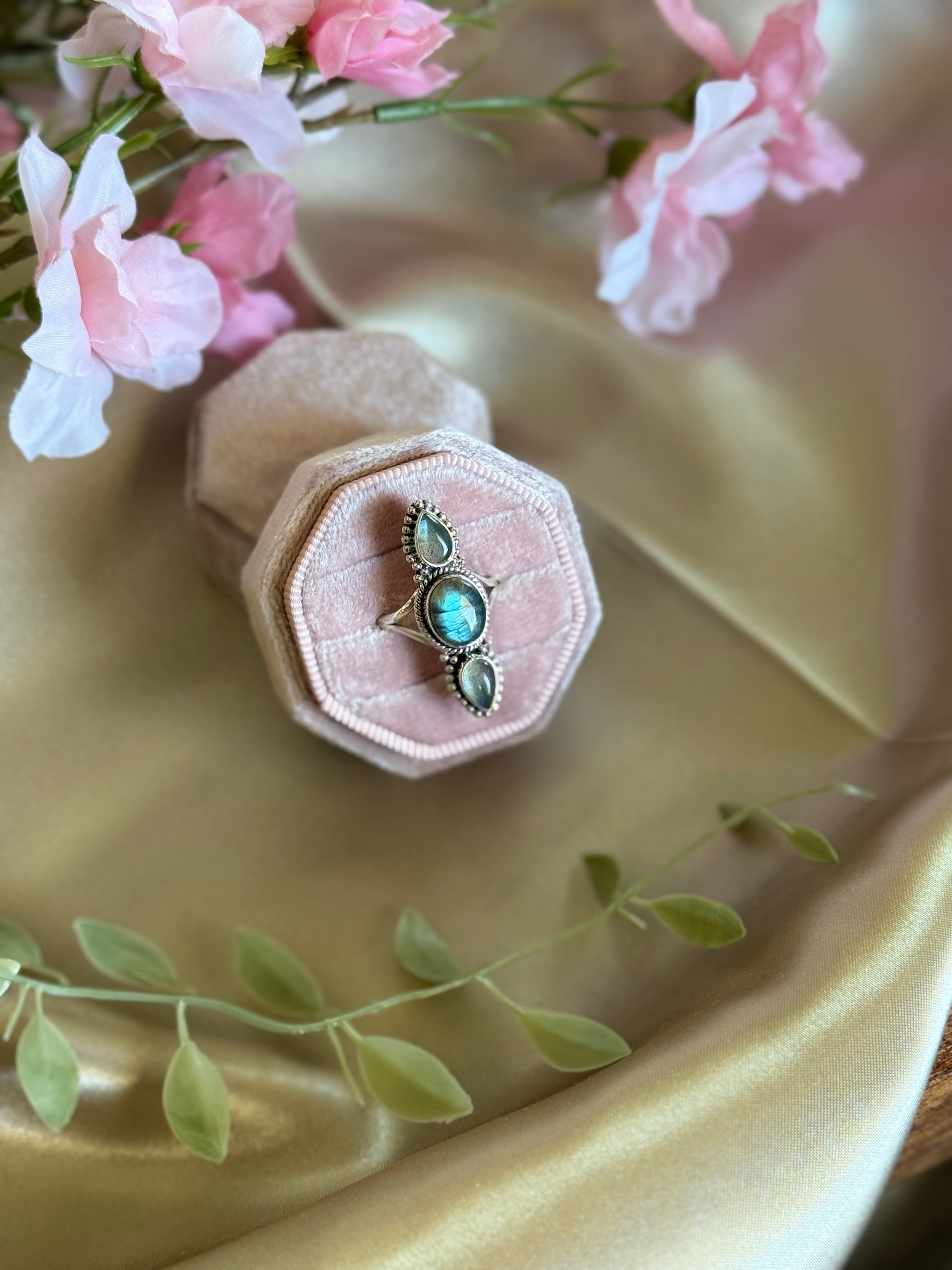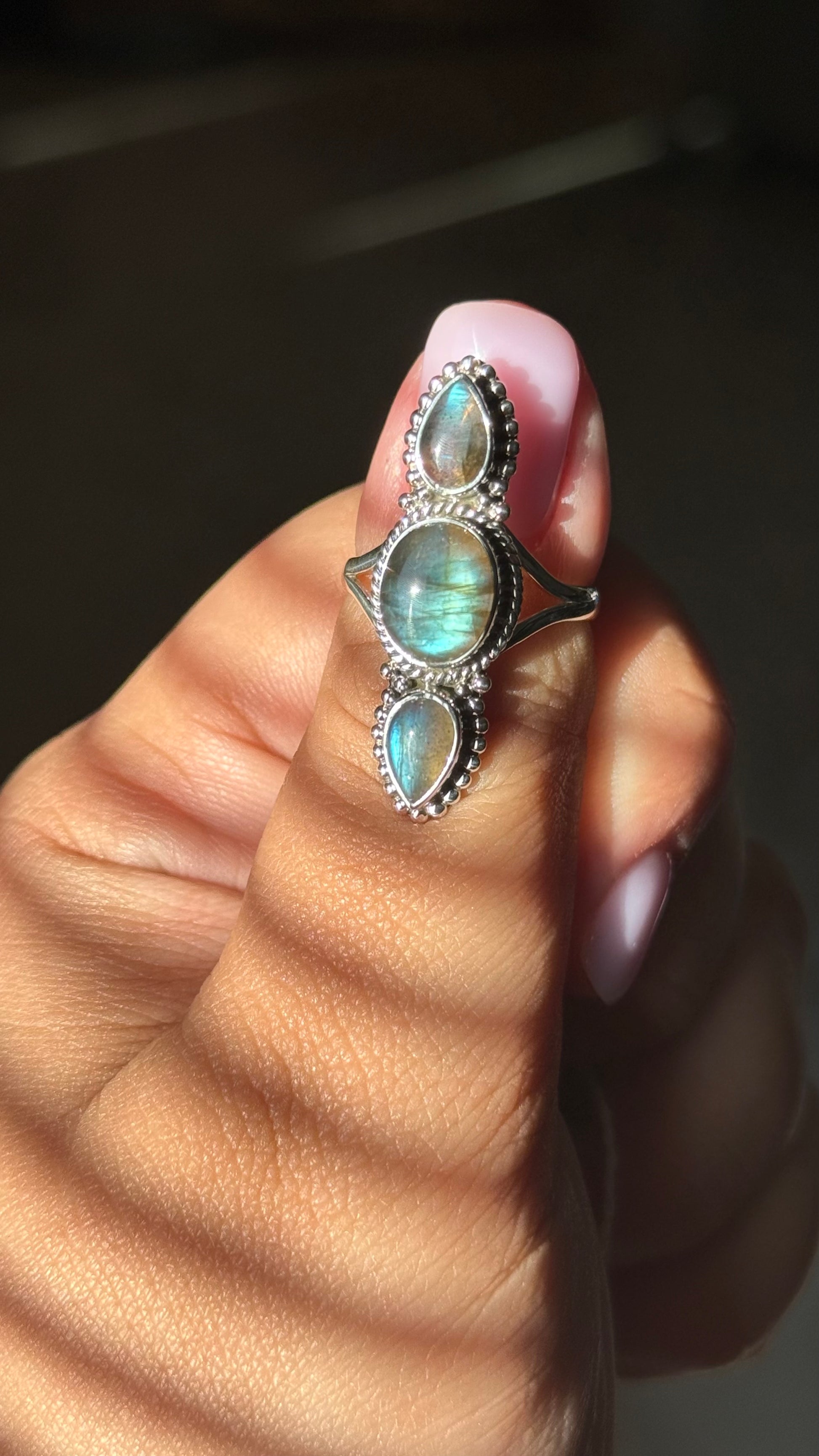 This piece features three enchanting labradorite stones, each showcasing its unique play of colors, set in a vertical line. All set in a sterling silver band. Ready to make a statement? This ring will do it for you!